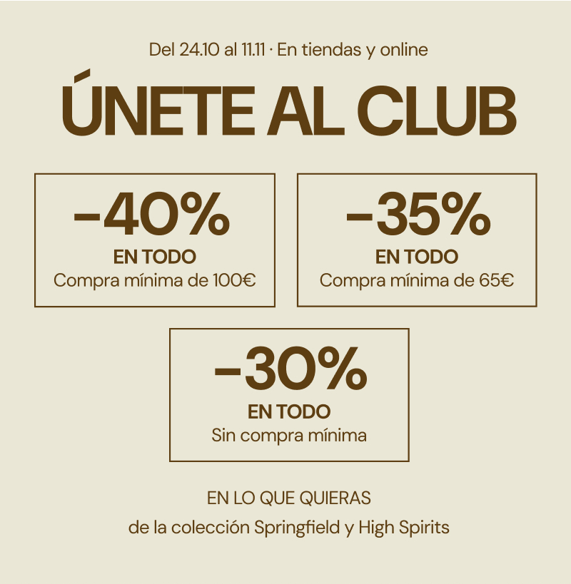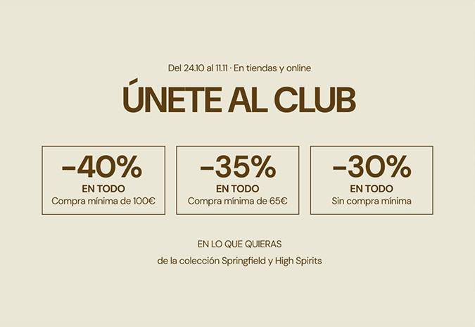 Al cumplimentar este formulario online recibirás un email con tu código para disfrutar de un 30% de descuento sin compra mínima; descuento del 35% por una compra mínima de 65€; y descuento del 40% por una compra mínima de 100€, en prendas incluidas en la Colección Otoño/Invierno 2025, excepto fragancias, de las marcas SPRINGFIELD y HIGH SPIRITS. Válido exclusivamente para nuevos socios del Springfield Club, del 24 de octubre al 11 de noviembre de 2025 en las tiendas Springfield de España y en la tienda online myspringfield.com de España. No acumulable a otras ofertas, promociones o descuentos. En el caso de prendas ya remarcadas, el descuento se aplicará sobre el precio inicial. Promoción válida para compras online realizadas desde tienda física (Click Shopping). En la tienda online y click shopping la promoción no es válida junto con dobletes. Para el uso del descuento en tienda física será necesaria la presentación del email recibido e identificarse como socio de Springfield Club y en tienda online tienes que logarte, estar identificado como socio de Springfield Club en el registro web e introducir el código recibido vía email antes de finalizar tu compra. Promoción no válida con el uso de Springfield Money, pero sí es acumulable a tu cuenta de socio.